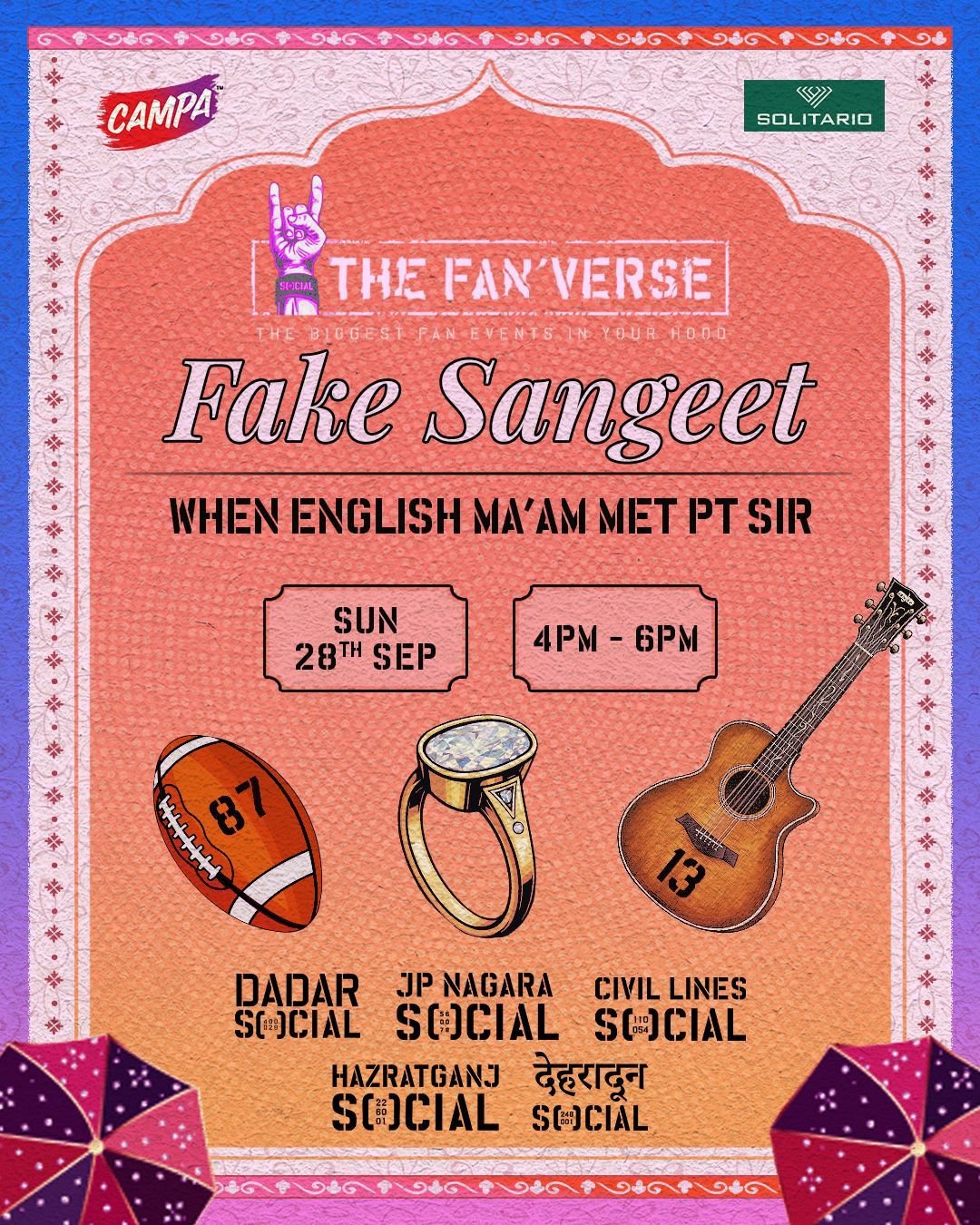 मेहमानों को पारंपरिक भारतीय परिधानों में आने और इस मस्तीभरे देसी-स्टाइल उत्सव का हिस्सा बनने के लिए आमंत्रित किया जाता है। इस मौके पर सोलिटारियो डायमंड्स पाँचों स्थानों पर शानदार डायमंड ज्वेलरी गिवअवे कर इस आयोजन में अतिरिक्त चमक जोड़ेंगे।