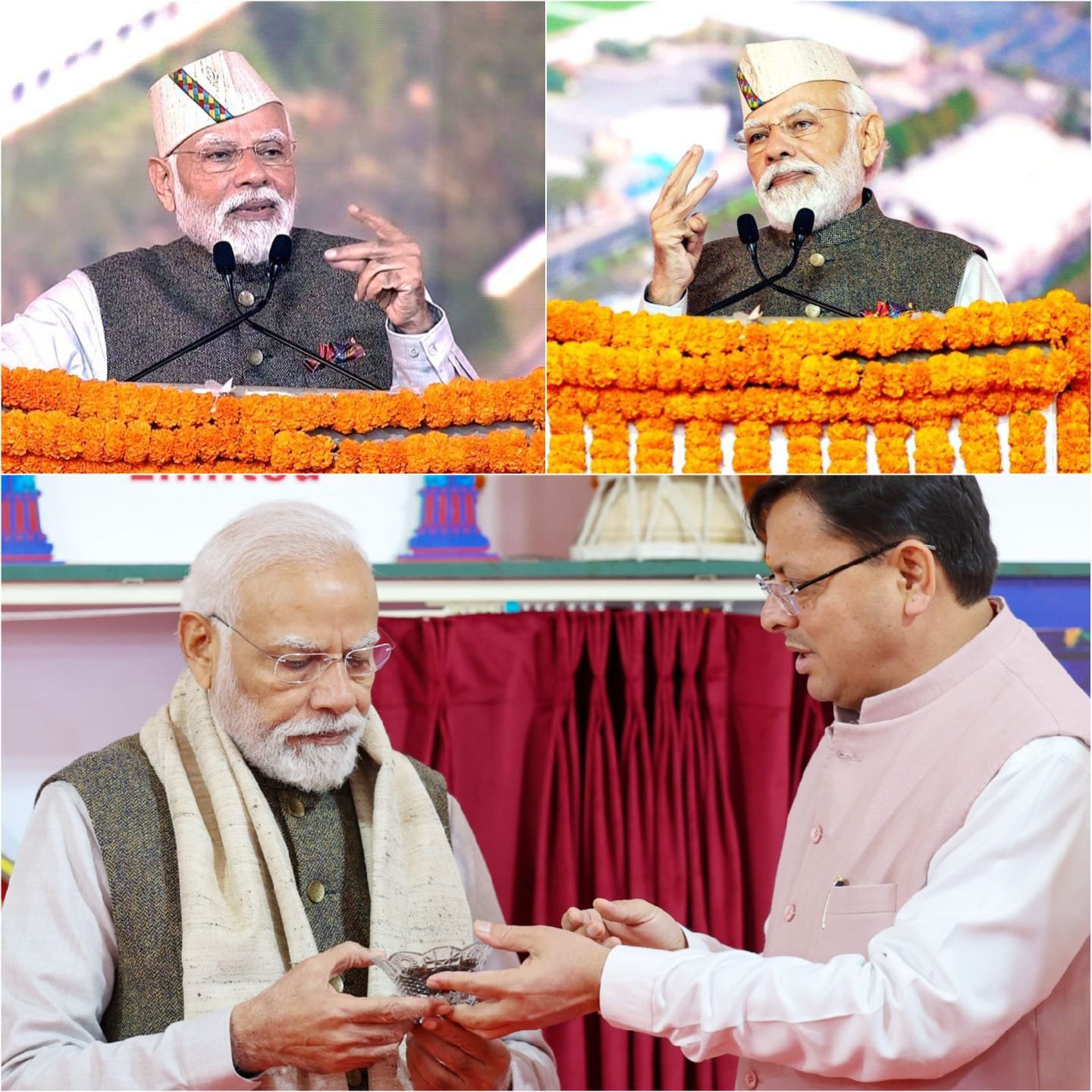 कार्यक्रम के दौरान, प्रधानमंत्री मोदी को राज्य के मुख्यमंत्री श्री पुष्कर सिंह धामी द्वारा एक शॉल और एक पारंपरिक पहाड़ी टोपी भेंट की गई। उत्तराखंड रेशम फेडरेशन के एमडी आनंद शुक्ल ने बताया कि, शॉल और टोपी विशेष रूप से उत्तराखंड सहकारी रेशम फेडरेशन द्वारा तैयार की गई थी, जो राज्य की समृद्ध सांस्कृतिक विरासत और कुशल शिल्प कौशल को उजागर करती है।