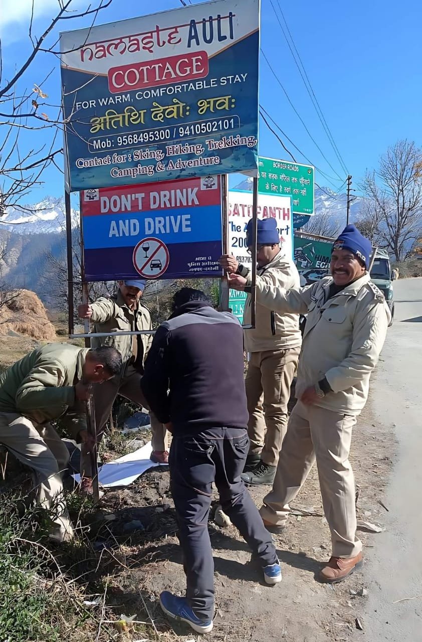 चमोली से संवाददाता विनय उनियाल : पुलिस अधीक्षक चमोली रेखा यादव (IPS) महोदया द्वारा आगामी 31st के दौरान जनपद के पर्यटक स्थल औली में बड़ी संख्या में आने वाले पर्यटकों व स्थानीय लोगो की सुरक्षा के दृष्टिगत यातायात पुलिस एवं प्रभारी निरीक्षक जोशीमठ को औली-जोशीमठ सड़क मार्ग पर रिफ्लेक्टर टेप, साइन बोर्ड व कान्वेन्स मिरर लगाने हेतु निर्देशित किया गया था। महोदया के आदेश के क्रम को प्रभारी निरीक्षक कोतवाली जोशीमठ राकेश चन्द्र भट्ट एवं यातायात उ0नि0 दिगम्बर उनियाल द्वारा औली जोशीमठ मार्ग पर अनेक स्थानों पर रिफ्लेक्टर टेप, साइन बोर्ड व कान्वेन्स मिरर लगाए गए। उक्त सड़क मार्ग पर पाला-बर्फवारी के कारण वाहन फिसलने व दुर्घटना की सम्भावना रहती है।