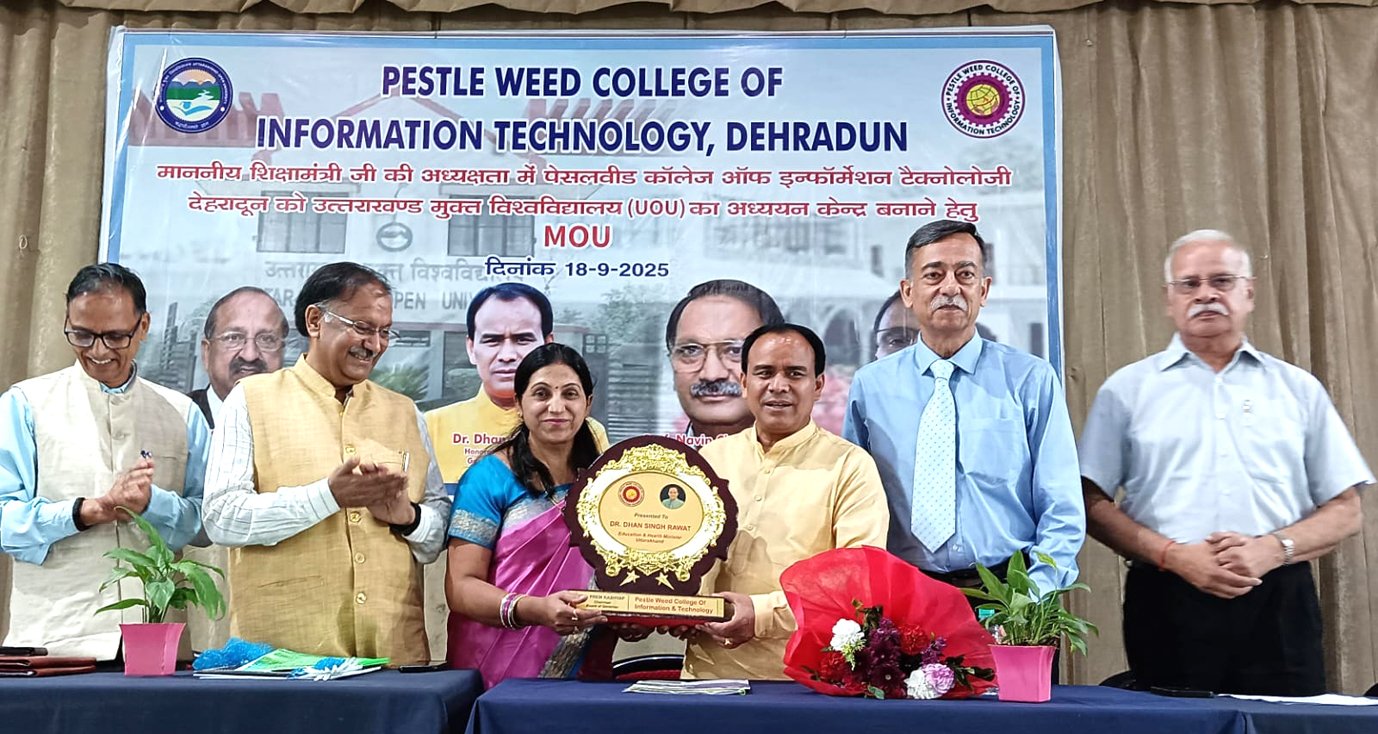 देहरादून। पेसल वीड कॉलेज ऑफ इन्फॉरमेशन टैक्नोलोजी, देहरादून में उत्तराखण्ड मुक्त विश्वविद्यालय के अध्ययन केंद्र बनाये जाने के लिए, उत्तराखण्ड के शिक्षा मंत्री डॉ. धन सिंह रावत की उपस्थिति में, उत्तराखण्ड मुक्त विश्वविद्यालय के कुलपति डॉ. नवीन चन्द्र लोहानी एवं रजिस्ट्रार डॉ. खेमराज भट्ट तथा पेसल वीड कॉलेज के अध्यक्ष डॉ. प्रेम कश्यप ने समझौता ज्ञापन पर हस्ताक्षर किए। इस कार्यक्रम के शुभारम्भ में शिक्षा मंत्री डॉ. धन सिंह रावत, कुलपति (यू.ओ.यू.) डॉ. नवीन चन्द्र लोहानी, कुलसचिव (यू.ओ.यू.) डॉ. खेमराज भट्ट, पेसल वीड कॉलेज के अध्यक्ष डॉ. प्रेम कश्यप, सचिव आकाश कश्यप, प्रबन्धन समिति के सदस्य विनोद शर्मा तथा मेजर जनरल शम्मी सबरवाल, किरन कश्यप, राशि कश्यप तथा पेसल वीड कॉलेज की प्राचार्या डॉ. अनिता वर्मा जी के द्वारा दीप प्रज्वलन से किया गया। तत्पश्चात छात्रों द्वारा रंगारंग कार्यक्रम की प्रस्तुति की गयी। सभी अतिथिगणों को महाविद्यालय की प्राचार्या डॉ. अनिता वर्मा द्वारा पुष्पगुच्छ एवं शॉल प्रदान कर स्वागत किया गया।