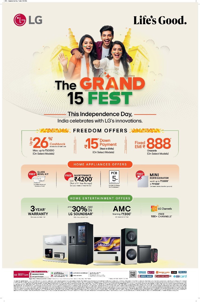नई दिल्ली: LG इलेक्ट्रॉनिक्स इंडिया ने स्वतंत्रता दिवस के मौके पर अपना नया कैम्पेन –’द ग्रैंड 15 फेस्ट’ पेश किया है। आजादी के इस खास मौके पर, LG अपने होम एप्लायंसेज और एंटरटेनमेंट प्रोडक्ट्स पर कई शानदार ऑफर्स और बंडल डील्स दे रहा है। यह ऑफर्स 20 अगस्त 2025 तक जारी हैं, जिसमें ग्राहक LG के प्रीमियम प्रोडक्ट्स से अपने घर को अपग्रेड कर सकते हैं।