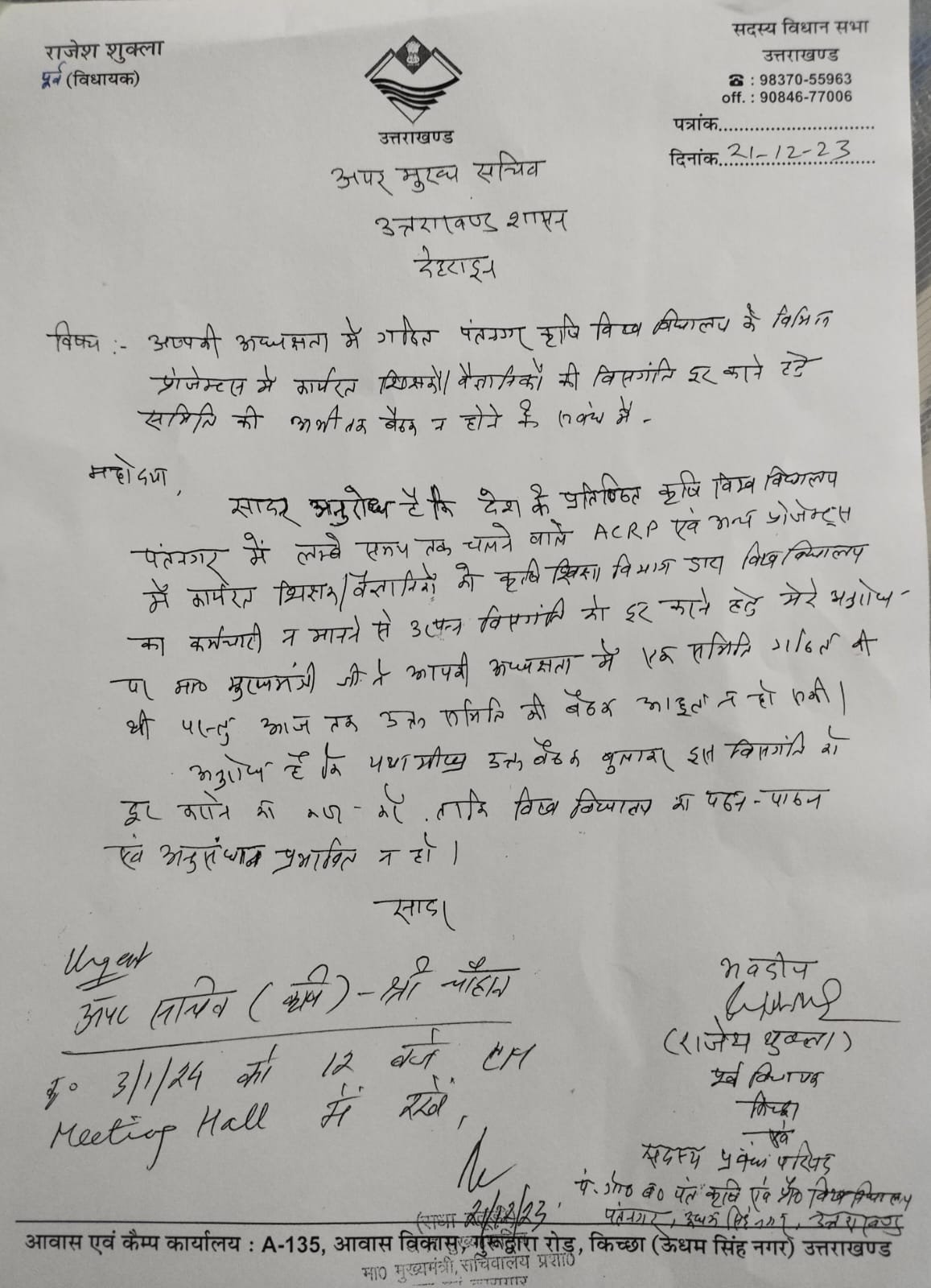 पूर्व विधायक राजेश शुक्ला ने अपर मुख्य सचिव राधा रतूड़ी से कहा कि देश के प्रतिष्ठित कृषि विश्वविद्यालय पंतनगर में लंबे समय तक चलने वाले एसीआरपी एवं अन्य प्रोजेक्ट्स में कार्यरत शिक्षको/ वैज्ञानिकों को कृषि शिक्षा विभाग द्वारा विश्वविद्यालय का कर्मचारी न मानने से उत्पन्न विसंगति को दूर करने हेतु मेरे अनुरोध पर मुख्यमंत्री पुष्कर सिंह धामी ने आपकी अध्यक्षता में एक समिति गठित की थी, परंतु आज तक उक्त समिति की बैठक आहूत ना हो सकी।