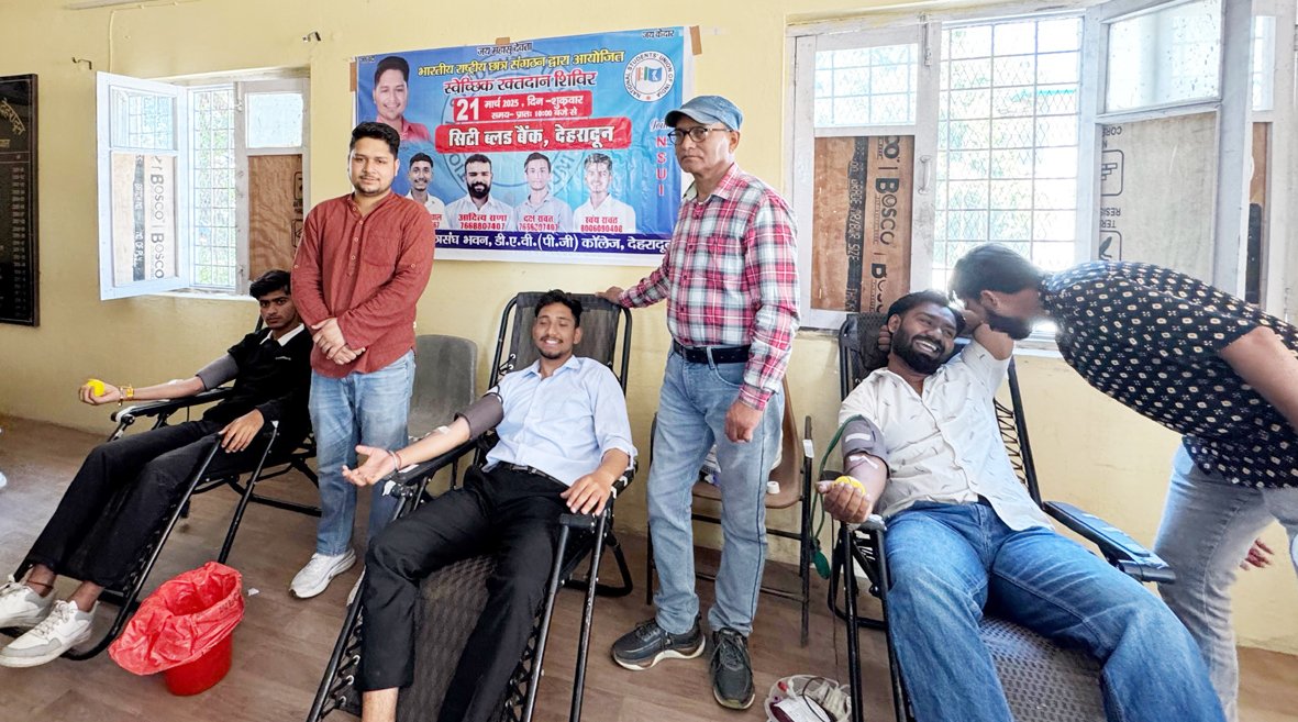 देहरादून : छात्रसंघ अध्यक्ष सिद्धार्थ अग्रवाल के नेतृत्व में एनएसयूआई कार्यकर्ताओं द्वारा डीएवी पीजी कॉलेज में स्वैच्छिक रक्तदान शिविर का आयोजन किया गया, जिसमें कई छात्र-छात्राओं व शिक्षकों ने बढ़-चढ़कर हिस्सा लेते हुए रक्तदान कर महान कार्य किया। इस दौरान एनएसयूआई जिलाध्यक्ष हिमांशु रावत,सौरभ सेमवाल,स्वयं रावत,दक्ष रावत,नितिन नेगी,उत्कर्ष जैन,मधुरम शर्मा,मंथन भाटिया,आकाश अवस्थी, आदि कई एनएसयूआई कार्यकर्ता मौजूद रहे।