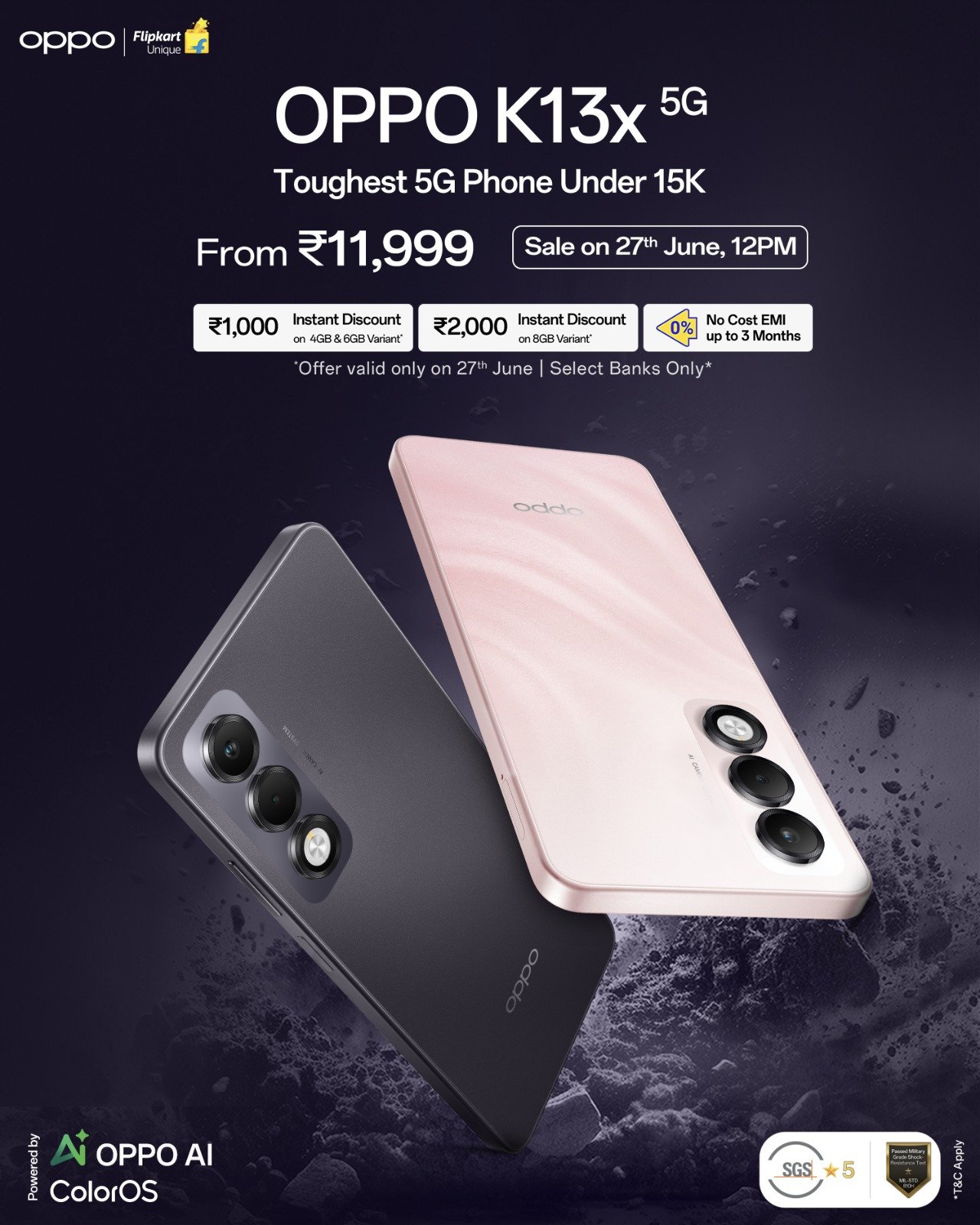 नई दिल्ली। OPPO K13x 5G में 360° डैमेज-प्रूफ आर्मर बॉडीप्रोटेक्शन, IP65 रेटिंग, 45W सुपरवूक चार्जर के साथ 6000mAh बैटरी, 50MP AI ड्युअल कैमरा के साथ ड्यूरेबिलिटी, स्टाइल एवं परफॉरमेंस जैसीखूबियां हैं, इसलिए यह 15K रुपये से कम मूल्य में अपने सेगमेंटका सबसे मजबूत स्मार्टफोन है। · यह 27 जून, दोपहर 12 बजे से सभी वैरिएंट्स पर इंस्टैंट डिस्काउंट और 3महीने तक की नो-कॉस्ट EMI के साथ Flipkart पर उपलब्ध होगा। नेशनल, जून, 2025: OPPO India ने अपने सेगमेंट में सबसे मज़बूत 5Gस्मार्टफोन OPPO K13x 5G पेश किया है। यह बिना किसी समझौते के ड्यूरेबिलिटी औरऑल-राउंड फंक्शनैलिटी पसंद करने वाले युवा विद्यार्थियों और प्रोफेशनल्स के लिए बनायागया है। K13x 5G SGS मजबूती के लिए गोल्ड ड्रॉप सर्टिफिकेशन और MIL-STD810H मिलिट्री-ग्रेड मानकों के साथ आता है। इसलिए यह अपनेसेगमेंट में सबसे अधिक मजबूत डिवाइस है। इसमें 360°डैमेज-प्रूफ आर्मर बॉडी है, जो एयरोस्पेस-ग्रेड AM04 एल्युमिनियम एलॉय से बनी है। क्रिस्टल शील्ड ग्लास और गहरेसमुद्री स्पंज से प्रेरित बायोमिमेटिक स्पंज शॉक एब्जॉर्प्शन सिस्टम इसकी मजबूतीको बढ़ा देते हैं। IP65 वॉटर और डस्ट रेजिस्टेंस के साथ,OPPO K13X 5G ड्यूरेबिलिटी का नया मानक स्थापित करता है, तथा स्टाइल या उपयोगसे समझौता किए बिना बेजोड़ मजबूती प्रदान करता है।OPPO K13x 5G के 4GB+128GB वैरिएंट का मूल्य INR11,999, 6GB+128GB वैरिएंट का मूल्य INR12,999 और 8GB+128GB वैरिएंट का मूल्य INR14,999 है। ये सभीवैरिएंट 27 जून 2025 से OPPO ई-स्टोर और Flipkart पर दोपहर 12 बजे से मिलना शुरू होंगे। ये दो कलर्स- मिडनाइट वॉयलेट और सनसेट पीच में आएंगे। इन स्मार्टफोन्स पर ग्राहकों को बैंकऑफर या INR1000 के एक्सचेंज बोनस और 3 महीने के नोकॉस्ट EMI विकल्प के साथ सेल के दिन 4GB और 6GB वैरिएंट पर INR1,000 का इंस्टैंटडिस्काउंट तथा 8GB वैरिएंट पर INR2,000 का इंस्टैंटडिस्काउंट मिलेगा, जिससे इनके प्रभावी मूल्य क्रमशः INR10,999, INR11,999 और INR12,999 हो जाएंगे।OPPO India के हेड,प्रोडक्ट कम्युनिकेशंस, सैवियो डिसूज़ा ने कहा,“हमारा OPPO K13X जेन ज़ी की जरूरतों को पूरा करने की हमारी प्रतिबद्धता प्रदर्शित करता है। यह बेहतरीनमूल्य में बेजोड़ ड्यूरेबिलिटी, शानदार परफॉरमेंस और इंटैलिजेंट पॉवर एफिशिएंसी प्रदानकरता है। K13X अत्याधुनिक बायोमिमेटिक शॉक एब्जॉर्प्शन सिस्टम,अपनी कैटेगरी के सर्वश्रेष्ठ बैटरी ऑप्टिमाइज़ेशन और 5Gरेडीनेस के साथ आता है।यह स्मार्टफोन “बिना किसी समझौते के एंट्री-लेवल स्मार्टफोनकी क्षमता के दायरे बढ़ाने” का OPPO का विज़न प्रदर्शितकरता है।स्मृति रविचंद्रन, वाइस प्रेसिडेंट, मोबाइल्स, Flipkart ने कहा, “Flipkart पर ऐसेस्मार्टफोन्स की मांग बढ़ रही है, जो बेहतरीन परफॉरमेंस देने के अलावा दैनिक जीवनकी मांग भी पूरी कर सकें। OPPO K13X 5Gबिना किसी समझौते के ड्यूरेबिलिटी की मांग को पूरा करने केलिए लॉन्च किया गया है।