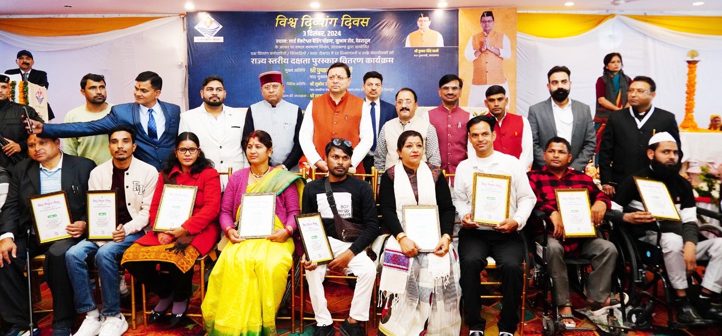 देहरादून । मुख्यमंत्री पुष्कर सिंह धामी ने मंगलवार को विश्व दिव्यांग दिवस के अवसर पर सुभाष रोड स्थित वैडिंग प्वाइंट में आयोजित दिव्यांग राज्य स्तरीय दक्षता पुरस्कार वितरण कार्यक्रम में 89 दक्ष दिव्यांग कर्मचारियों, खिलाड़ियों एवं स्वतः रोजगार रत दिव्यांगजनों व उनके सेवायोजकों को राज्य स्तरीय दक्षता पुरस्कार प्रदान कर सम्मानित किया, जिसमें 25 दक्ष दिव्यांग कर्मचारी, 32 दक्ष दिव्यांग खिलाड़ी, 30 स्वतः रोजगार रत दिव्यांगजन एंव 2 दिव्यांगजनों के सेवायोजक सम्मिलित थे।