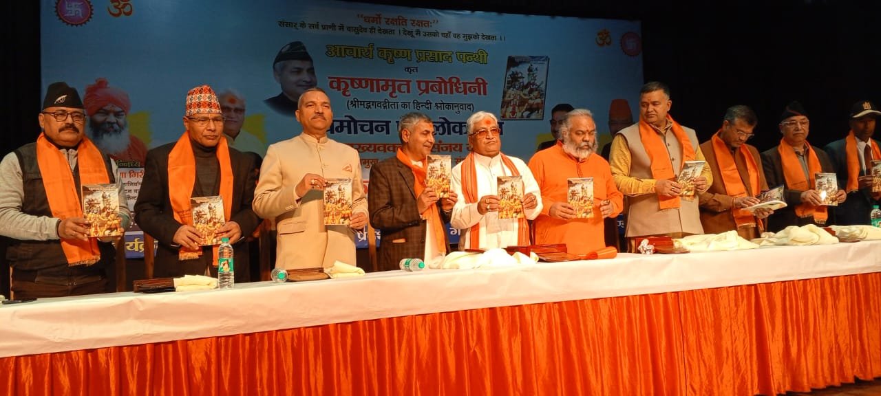 देहरादून। मंगलवार को आई.आर.डी.टी. प्रेक्षागृह ( सर्वे चौक ) में भव्य रूप से आचार्य पंडित कृष्ण प्रसाद पन्थी द्वारा लिखित श्रीमद भागवत गीता पर आधारित हिन्दी श्लोकानुवाद ” कृष्णामृत प्रबोधनी ” पुस्तक का विमोचन महन्त श्री कृष्णा गिरी जी महाराज (टपकेश्वर महादेव मंदिर ),विधायक उमेश काउ, सौरभ थपलियाल (मेयर,देहरादून),जनरल ए.के.सिंह ( सदस्य राष्ट्रीय सुरक्षा सलाहकार परिषद),आचार्य सुभाष जोशी (अध्यक्ष,वरिष्ठ नागरिक कल्याण परिषद ),और संजय जी ( प्रान्त प्रचारक प्रमुख,राष्ट्रीय स्वयंसेवक संघ ) के कर-कमलों द्वारा किया गया। इस पुस्तक के प्रकाशन का उद्देश्य ” श्रीमद भागवत गीता ” में लिखे गये श्लोकों का हिन्दी में अनुवाद कर जनमानस में प्रचार,भारतीय संस्कृति का जागरण तथा सामाजिक,साहित्यिक एवं आध्यात्मिक संवाद स्थापित करना है।