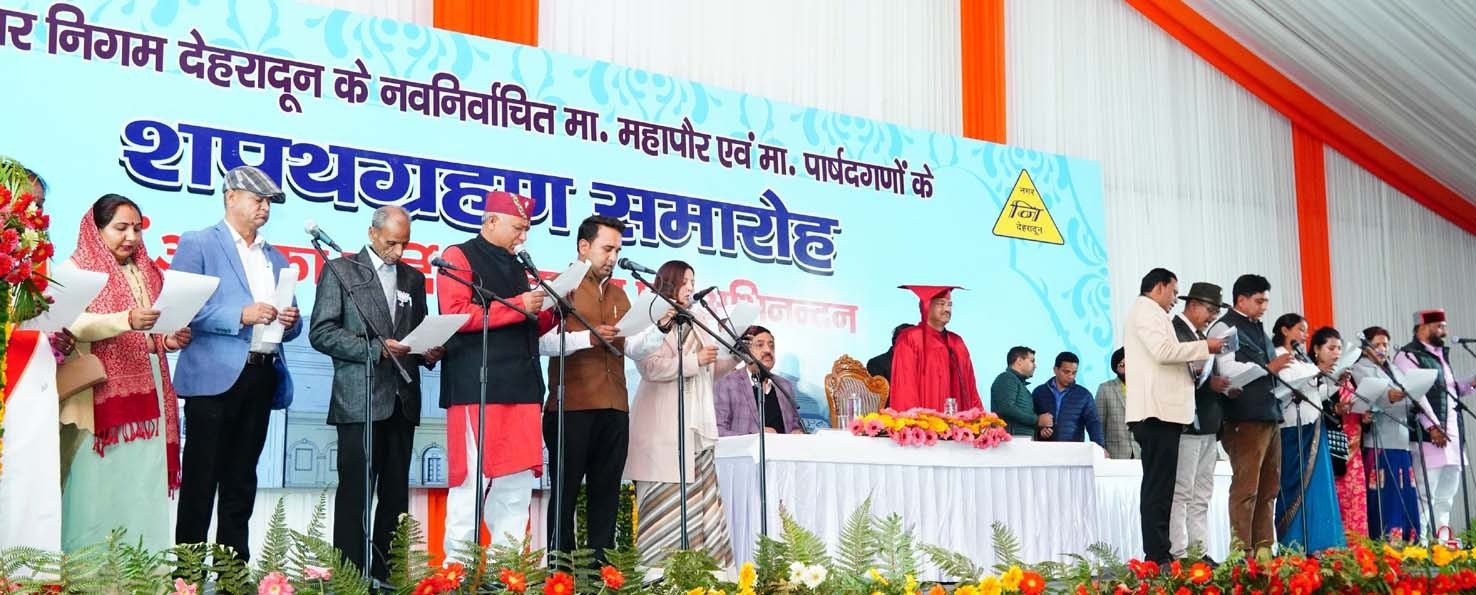 देहरादून । मुख्यमंत्री पुष्कर सिंह धामी की उपस्थिति में शुक्रवार को नगर निगम प्रांगण, देहरादून में नगर निगम देहरादून के नवनिर्वाचित महापौर सौरभ थपलियाल एवं पार्षदों ने पद एवं गोपनीयता की शपथ ग्रहण की। इस अवसर पर मुख्यमंत्री ने नगर निगम प्रांगण में पौधारोपण कर स्वच्छ और सुंदर देहरादून का संदेश दिया। देहरादून नगर निगम के नवनिर्वाचित महापौर सौरभ थपलियाल को कमिश्नर गढ़वाल विनय शंकर पांडे ने शपथ दिलवाई एवं सभी निर्वाचित पार्षदों को सौरभ थपलियाल द्वारा शपथ दिलावाई गई। इस अवसर पर कैबिनेट मंत्री प्रेमचंद्र अग्रवाल, गणेश जोशी, विधायक खजान दास, सविता कपूर, विनोद चमोली, बृजभूषण गैरोला, दुर्गेश्वर लाल, विनय रोहेला,विश्वास डाबर, आयुक्त नगर निगम नमामि बंसल, एवं अन्य लोग मौजूद रहे।