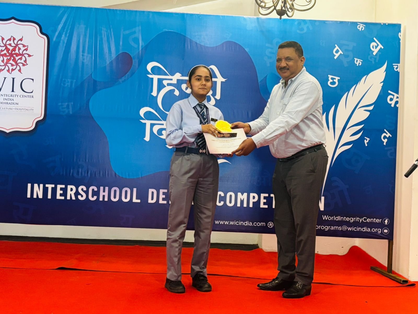 देहरादून: वर्ल्ड इंटेग्रिटी सेंटर (डब्लूआईसी) इंडिया, देहरादून ने हिंदी दिवस 2025 के अवसर पर राजपुर रोड स्थित अपने परिसर में अंतरविद्यालयी हिंदी वाद-विवाद प्रतियोगिता का आयोजन किया। इस प्रतियोगिता में देहरादून के नौ विद्यालयों—आईआईटी चिल्ड्रन अकैडमी, जसवंत मॉडर्न स्कूल, हिम ज्योति स्कूल, पॉली किड्स स्कूल, पाइन हॉल स्कूल, सृजन स्कूल, पीएम श्री जीजीआईसी (राजपुर रोड), शिक्षांकुर द ग्लोबल स्कूल और साईग्रेस अकैडमी इंटरनेशनल—के छात्रों ने उत्साहपूर्वक भाग लिया। युवा प्रतिभागियों ने विचारोत्तेजक विषय “सोशल मीडिया – अभिव्यक्ति की स्वतंत्रता या भ्रम का जाल?” पर अपने पक्ष और विपक्ष के विचार प्रस्तुत किए। छात्रों ने सोशल मीडिया को अभिव्यक्ति के मंच और भ्रम के जाल—दोनों रूपों में परखते हुए प्रभावशाली तर्क रखे।